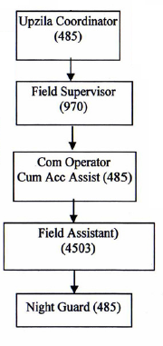 উপজেলা সমন্বয়কারী, ফিল্ড সুপারভাইজার, কম্পিউটার অপারেটর কাম হিসাব সহকারী, মাঠসহকারী